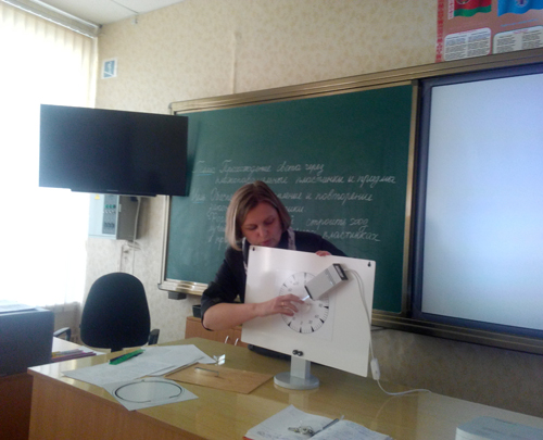 Учитель Гусаковская Е.В. показала элемент урока с использованием оптического диска, которого, по мнению учителя, давно не хватало в школе для демонстрации опытов по разделу «Оптика» в XI классе.