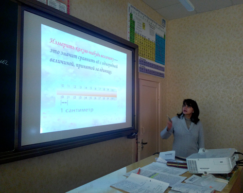 Учитель Жидкова И.В. демонстрировала элемент урока в VI классе на тему «Единицы измерения. Измерительные приборы» с использованием нового оборудования (градусник, мензурка, штанген-циркуль, рулетка) и возможностей интерактивной доски.
